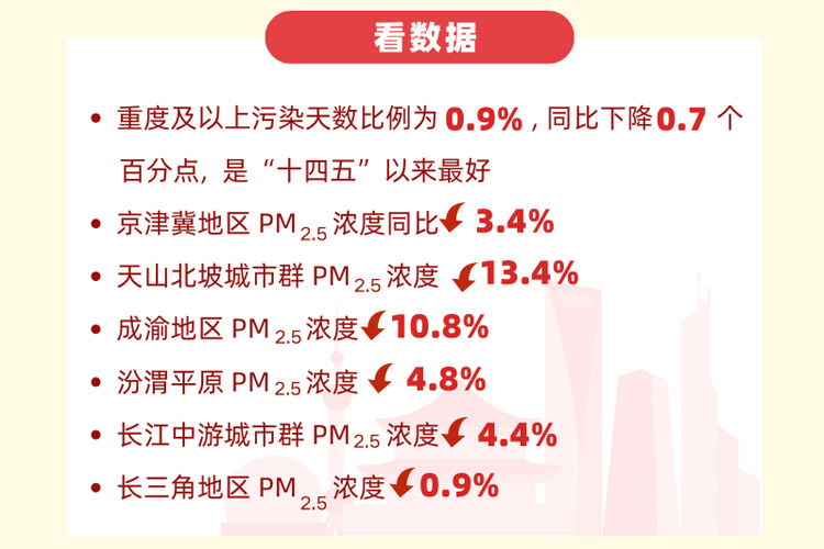 2025年政府工作報(bào)告指出,2024年生態(tài)環(huán)境質(zhì)量有新改善,地級及以上城市細(xì)顆粒物(PM2.5)濃度下降2.7%,優(yōu)良天數(shù)比例上升至87.2%。